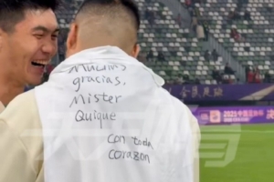 赛后,王刚披上了一件T恤,上面用西班牙语写上了:“衷心感谢您,塞蒂恩主教练!”
