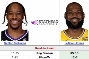 生涯至今,德罗赞常规赛面对詹姆斯13胜36负(胜率26.5%),季后赛2胜12负(14.2%)。