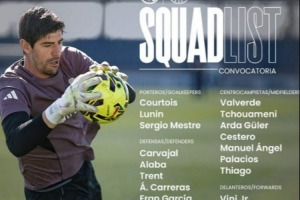 体育资讯3月2日讯 本轮西甲皇马将迎战赫塔费,球队官方也公布了本场比赛大名单,其中姆巴佩、卡马文加缺席,罗德里戈、赫伊森回归。具体如下: