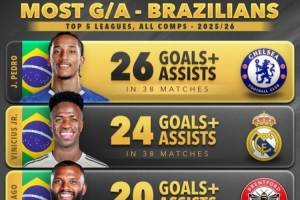 五大联赛巴西球员参与进球榜:佩德罗26球居首,维尼修斯24球
