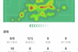 射门0、尝试过人1次并且成功、丢失球权10次