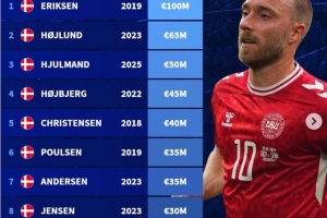 体育资讯10月13日讯 德转统计了丹麦球员历史身价榜,埃里克森1亿欧位列第一。