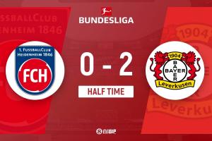 上半场比赛结束,海登海姆0-2勒沃库森。