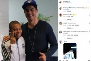 赛后,姆巴佩更新社媒,发布了本场比赛自己进球后模仿C罗“SIUUU”庆祝的图片和自己少年时与C罗的合影,并配文道:“相信你的梦想。致敬王者👑🐐”并@了C罗的账号。