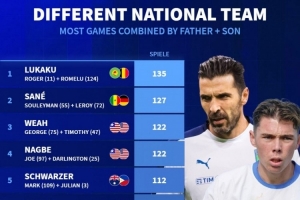 体育资讯11月20日讯 德国转会市场统计了足坛父子代表不同国家队的出场次数,并列出榜单,布冯儿子路易斯·布冯一周之内在捷克U19青年队两次戴帽,有望入选捷克成年队,因此德转也提前将布冯父子列入榜单。