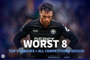 本赛季五大联赛各项赛事场均拿分最少榜:狼队垫底 西汉姆倒数第7