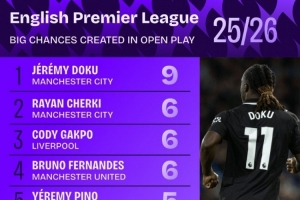 本赛季英超运动战创造重大机会排名: