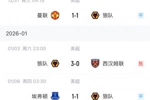 体育资讯01月08日讯 英超第21轮,狼队客场1-1战平埃弗顿,英超副班长近3轮保持不败,连拿5分!
